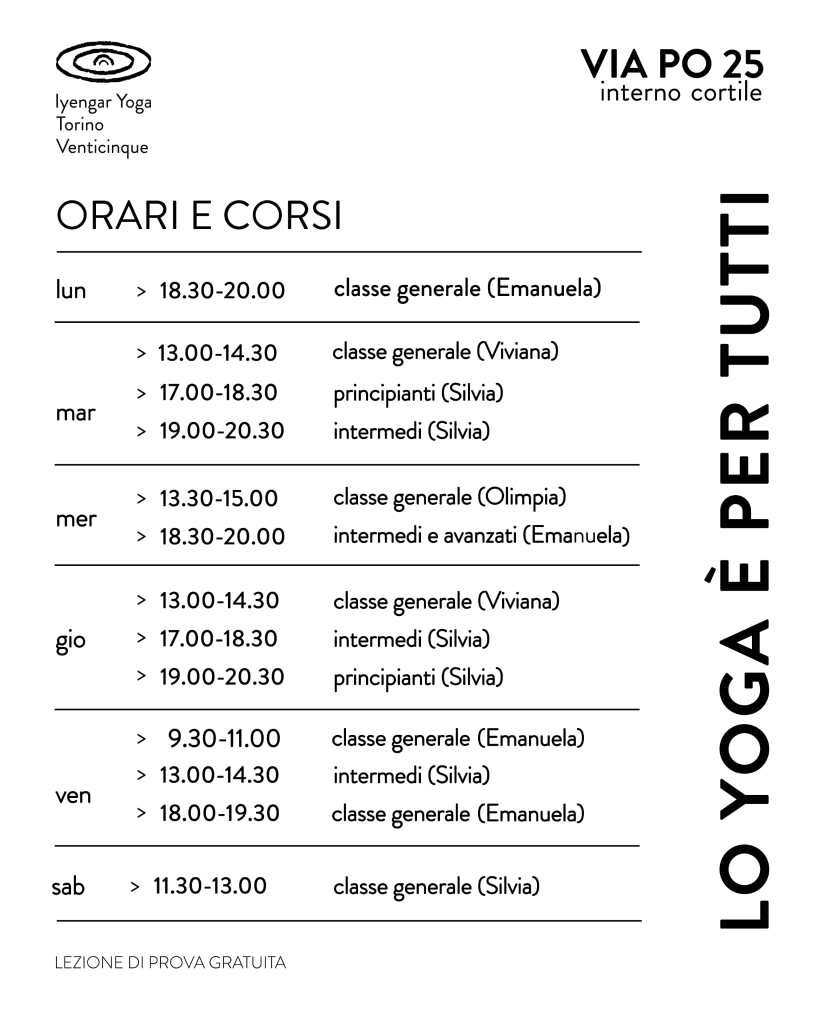 Scopri la nuova sala in pieno centro di Torino dedicata solamente all’IYENGAR(R)Yoga, con lezioni di un’ora e trenta minuti tutte a cura di insegnanti certificate. Lo spazio può ospitare fino a 20 tappetini. L’ingresso è riservato ai soci di Yoga Akhu APS.